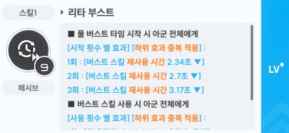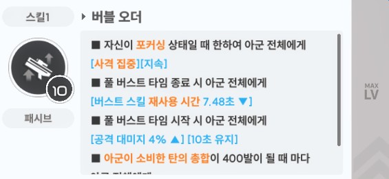 1버스트는 쿨감(버스트 스킬 재사용 시간 감소)과 버프력을 주로 보게 됩니다. 거의 조건 없이 쿨감이 발동되는 세이렌이 있으면 좋겠지만 세이렌을 뽑지 못하더라도 여전히 현역으로 뛰고 있는 1버인 리타를 리쿠르트 포인트로 확정적으로 데려갈 수 있습니다. 리타는 버스트가 3회 이상 발동되어야 쿨감이 최대치로 발동되기 때문에 루주, 동D를 추천하기도 합니다. 하지만 당연히 데려갈 수 있다면 세이렌을 데려가는 것이 좋습니다.