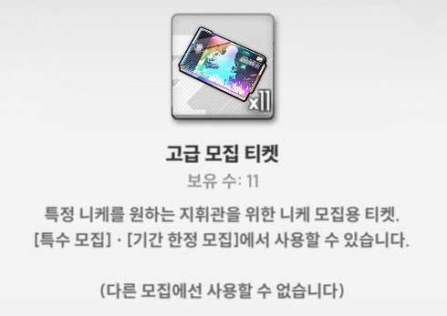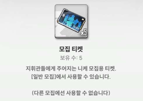 일반모집의 경우 40회 이상부터 위시리스트가 등록이 가능하며 위시리스트 안의 SSR을 확률적으로 뽑을 수 있습니다. 1뽑기당 1실버마일리지티켓과 1보너스리쿠르트 포인트를 줍니다. 실버마일리지 티켓 200장으로 로테이션되는 니케의 스페어바디(니케아님 돌파재료임)를 교환할 수 있습니다. 보너스리쿠르트 포인트를 100모아 리타/티아/나가/헬름/엘리스 중 선택해 최대 10회까지 교환 할 수 있습니다.