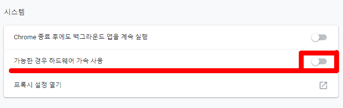 "가능한 경우 하드웨어 가속 사용" 이라는 부분이 있는데