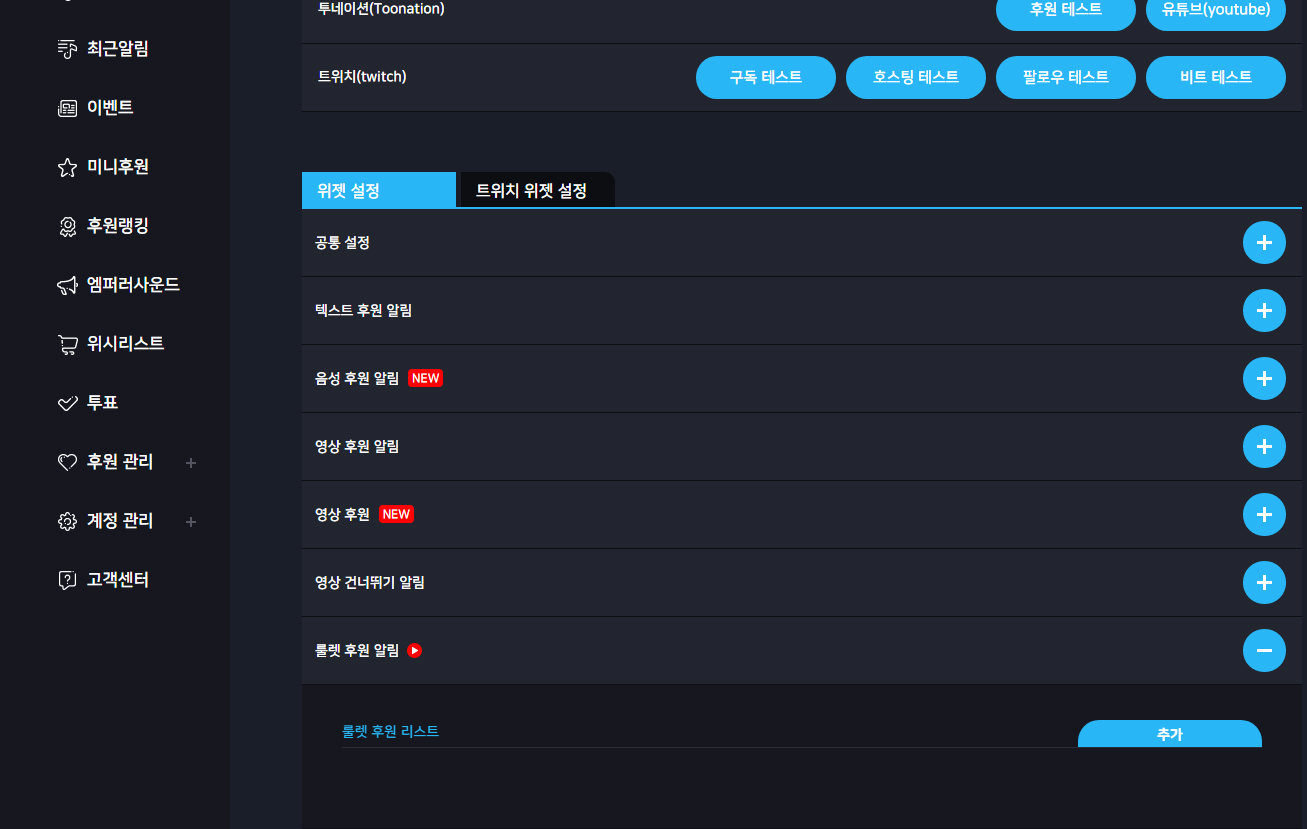 룰렛 알터창(알림창) 세팅은 기존 후원 레이어에 등록이 되어 있으실테니 넘어가도록하고
