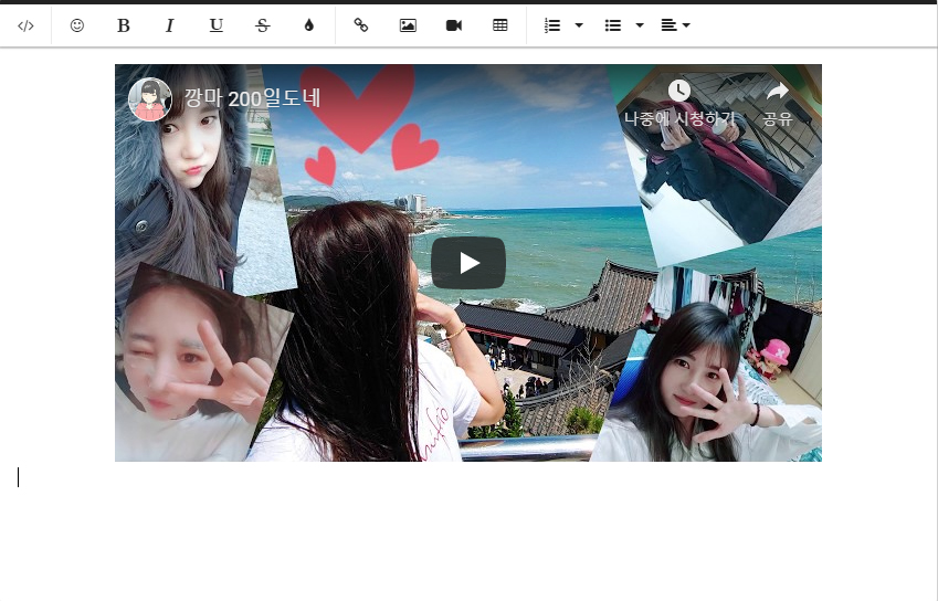 자 트게더 글쓰기를 하시고 위에 <동영상 삽입>버튼을 누르시고