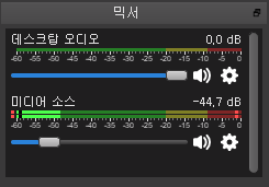 우선 믹서에서 저는 <미디어소스>로 되어있으나 여러분은 <마이크>로 되어있어야 합니다