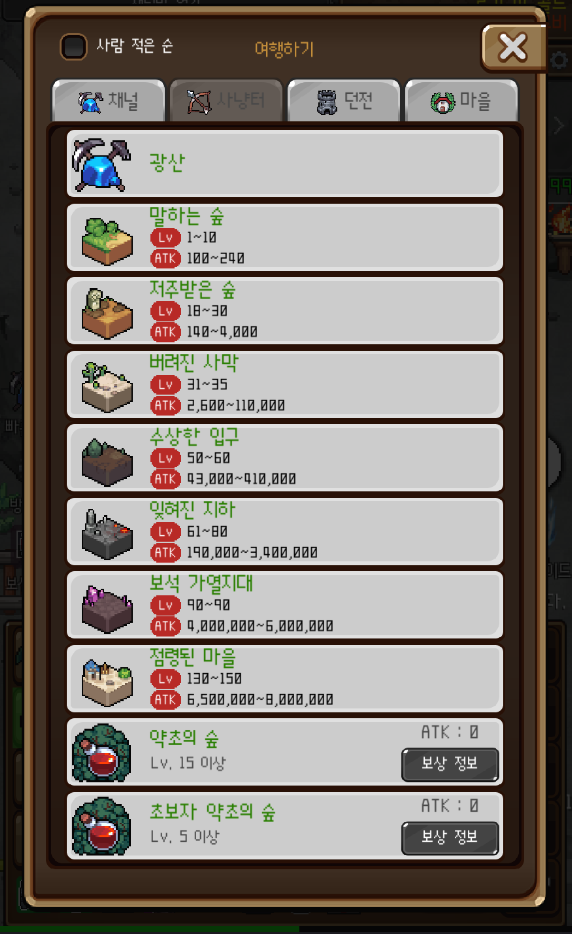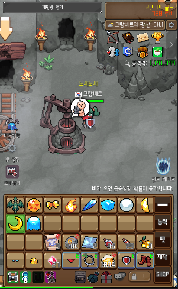 사냥터도 있고... 광산던전을 돌면 기본적으로 나오는 돌멩이가 바뀐다
