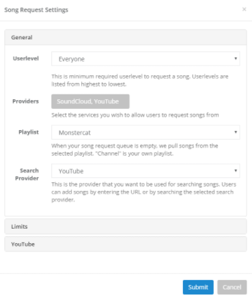 Song Requests Let your viewers choose the tunes that play on your stream. Viewers can choose songs from YouTube or SoundCloud, and there are also playlists available to play when there are no more requested songs. Giveaways Wanted to give away a gift to on