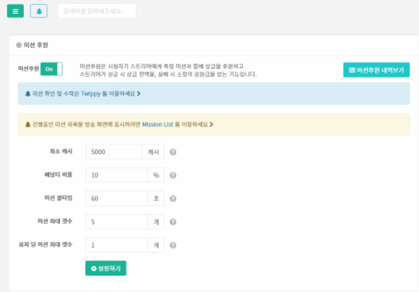 미션후원을 ON으로 두시면 기본 설정은 끝!
