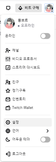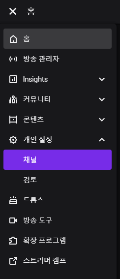 스트리머 대시보드에 들어가서 홈->개인설정->채널로 이동해서