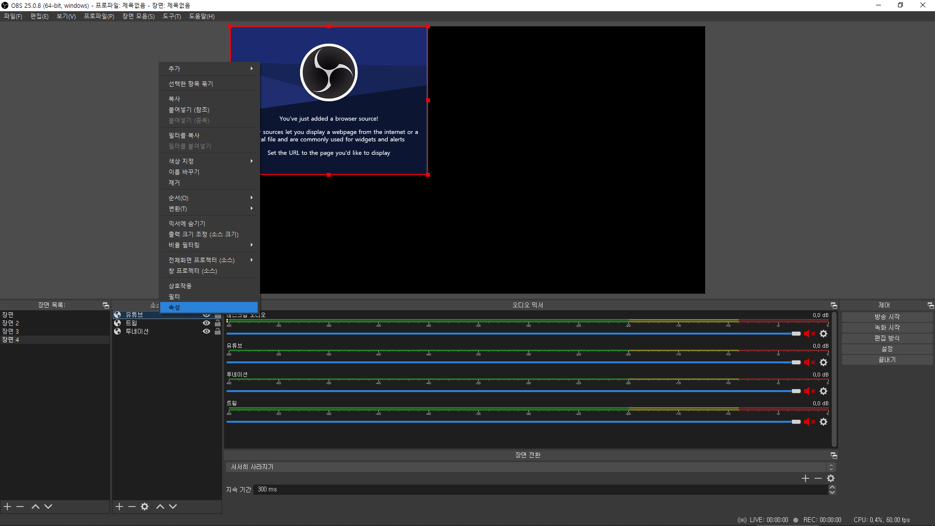 OBS 트윕/투네이션을 추가한 브라우서소스에서 우클릭->속성
