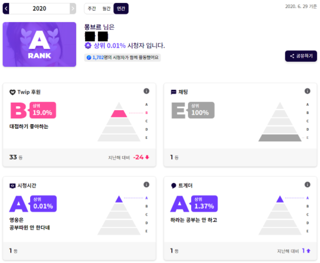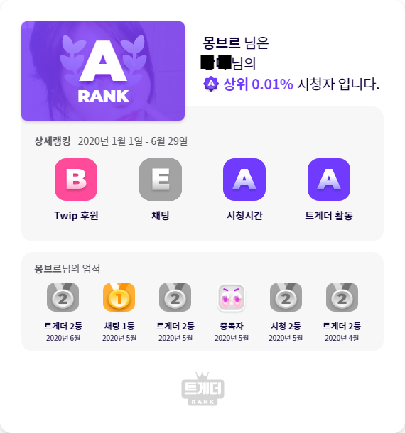 트윕 후원내역, 채팅내역, 시청시간, 트게더이용률을 가지고 점수를 매기는 시스템같은데...