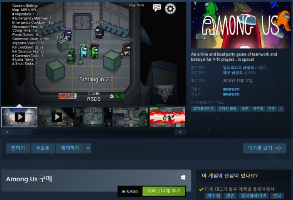 스팀할인이 끝난터라 어몽어스 구매하려면 쬐큼 돈이 들어가는데요