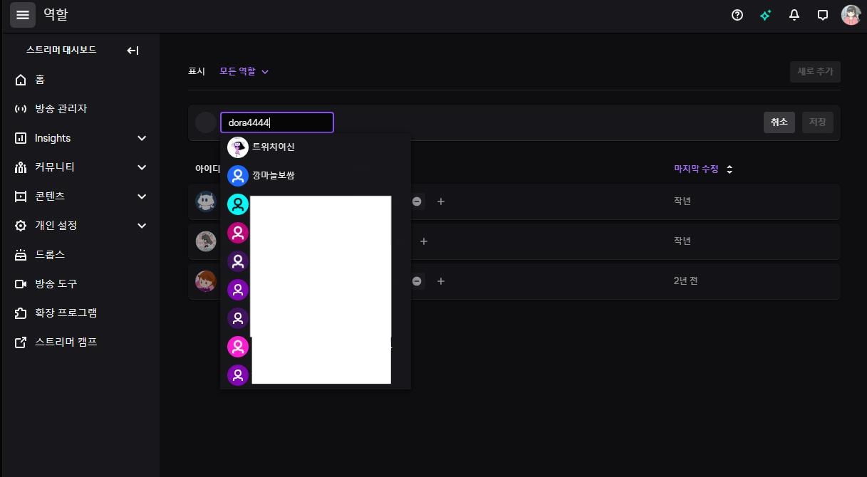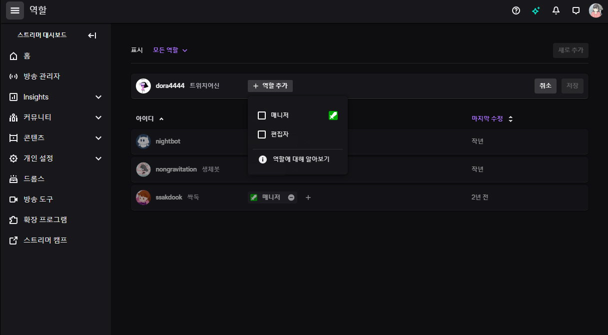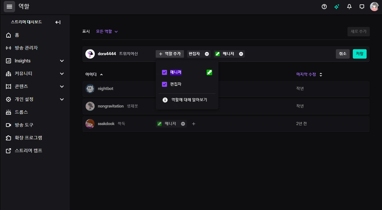 편집자나 매니저 권한 주실분을 검색하시고 선택해서