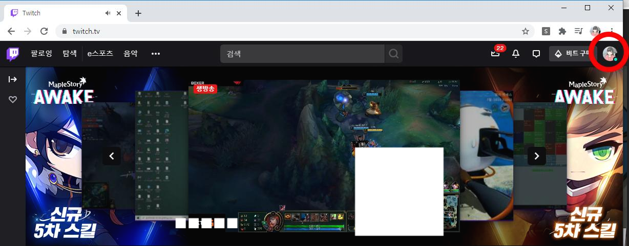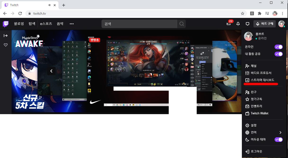 트위치사이트에서 오른쪽 위에 프로필 아이콘을 누르시구요