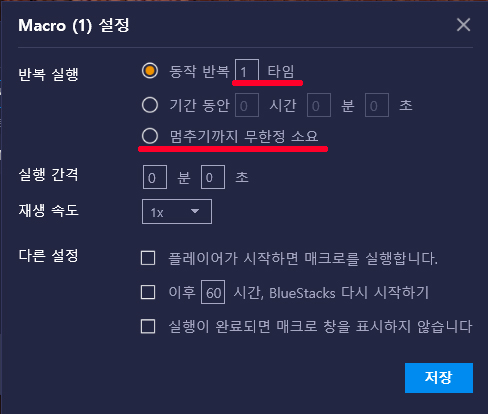 설정 버튼을 눌러주고 몇타임 반복할껀지, 멈출때까지 계속반복할건지 설정해주고 저장하면 됩니다