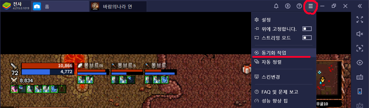 상단메뉴를 누르고 동기화작업을 누릅니다