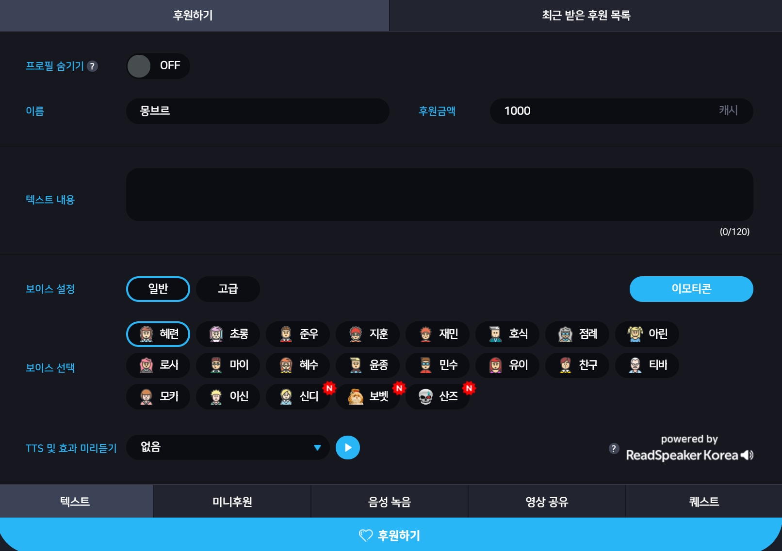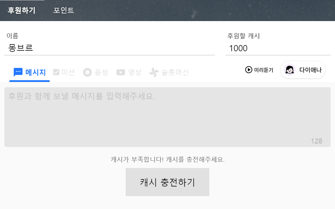 실질적으로 한국에서 가장 많이 사용하는 후원방식입니다. 영상/음성/TTS/룰렛/퀘스트(미션) 등등이 가능하고 뭐 꾸미기에 따라 다양하게 활용 가능하고 기존 비트보다 수수료가 훨씩 적다는 장점이 있습니다.