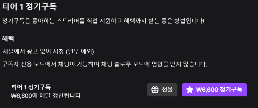 구독은 일단 방송을 보면서 광고가 나오지 않고, 구독뱃지와 구독티콘을 이용 할 수 있기 때문에 후원을 잘 하지 않는 분들도 이용하는 서비스중 하나입니다. 1티어 6600원, 2티어 13200원, 3티어 33200원으로 티어별로 가격차이가 있으며 또한 티어별로 수수료에도 차등이 있습니다. 그리고 동일한 1티어 구독이라도 pc에서는 6600원, 모바일에서는 7500원으로 모바일이 더 높은 가격에 책정되어있습니다(근데 스트리머한테 가는 정산금액은 동일함;;)