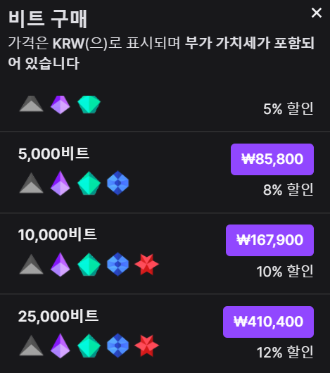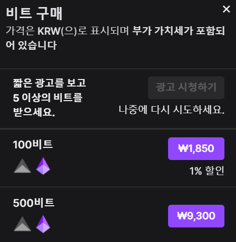 비트는 수수료가 어마무시하다고 말도 많고 탈도 많은 후원방식중에 하나입니다. 실제로 100비트를 결제하면 1850원이 들어가지만 실제로 스트리머에게 지급되는건 천원가량입니다. 거의 40%~55% 정도 수수료가 나간다고 보시면 될것 같습니다. 다만 스트리머는 받는 금액이 직관적으로 보이니 산수하기는 조금 편하겠네요;;; 원화 결제가 추가되면서 기존에 환전수수료가 사라지긴 했지만 그래도 여전히 전체 수수료가 어마무시한건 사실인데다가 국내 시청자들이 많이 쓰는 영상후원과 음성 후원이 불가능 하기 때문에 한국에선 이용율이 낮은 편입니다.