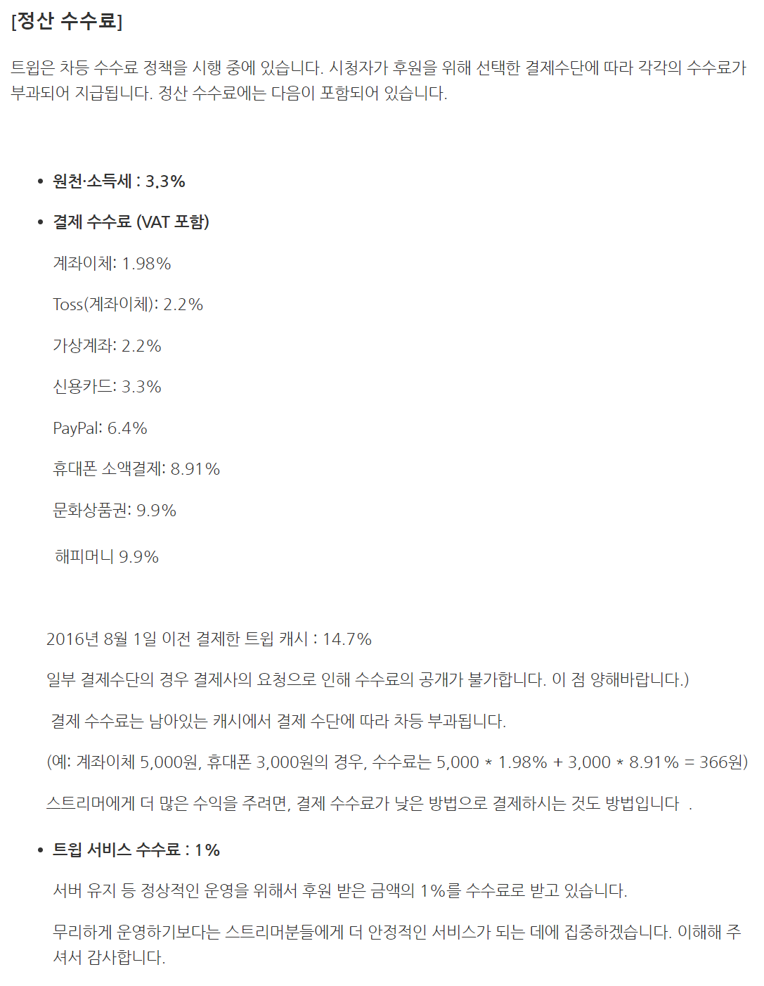 가장 궁금해하고 관심이 많이 가는 부분이 수수료 일겁니다. 직접적으로 내가 후원해서 스트리머가 받는돈, 그리고 스트리머는 수익과 직결되는 부분으니까요. 수수료를 포함해서 이것저것 좀 적어보겠습니다.