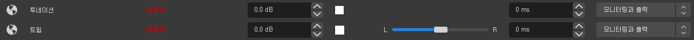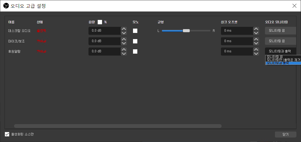 오디오믹서 우측 톱니바퀴클릭 -> 오디오 고급설정 클릭 -> 새로등록한 후원알람 오디오모니터링을 모니터링과 출력으로 변경