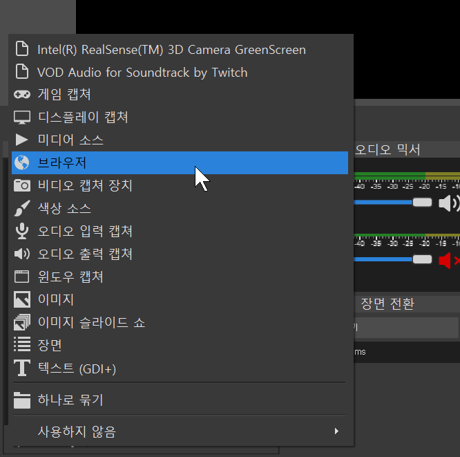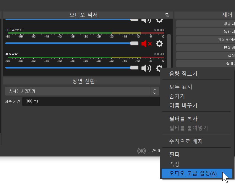 1. obs사용중이고 [obs를 통해 오디오 조절]옵션이 체크되어있음