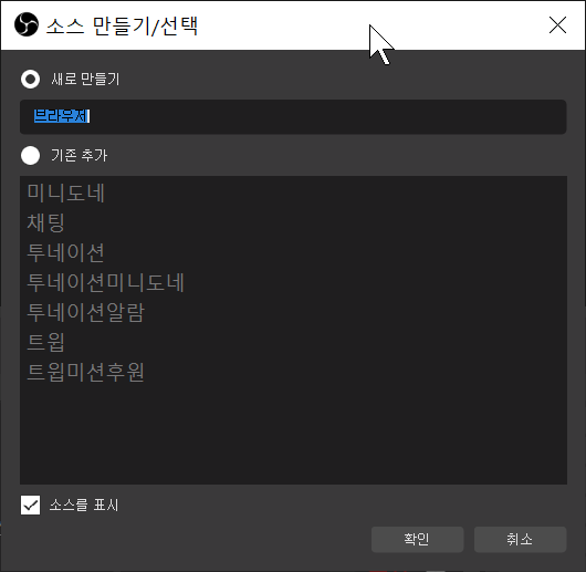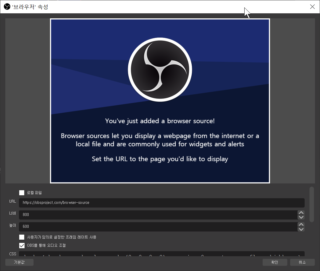 소스목록하단에 [+] 클릭 -> 브라우저를 클릭 -> 이름을 정해주고 확인 클릭 -> URL칸에 후원알람위젯 주소를 붙여넣고 살짝 아래쪽에 [OBS를 통해 오디오 조절]에 체크 후 확인 클릭
