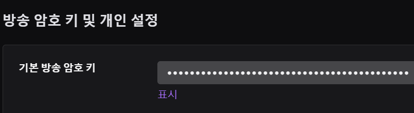 스트리머대시보드 좌측메뉴의 개인설정->채널에 들어가시면 기본 방송 암호 키를 획득 할 수 있습니다. 송출 프로그램 및 여러 프로그램들과의 연동을 위해서 필요하기 때문에 어디서 볼 수 있는지 확인 해 두는 것이 좋습니다.