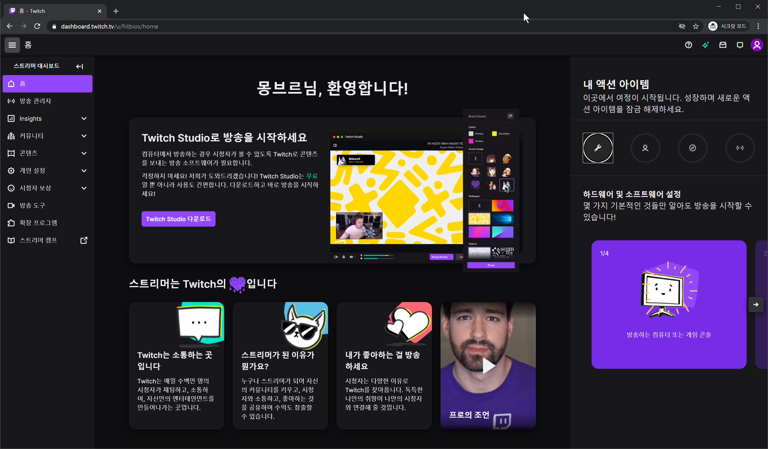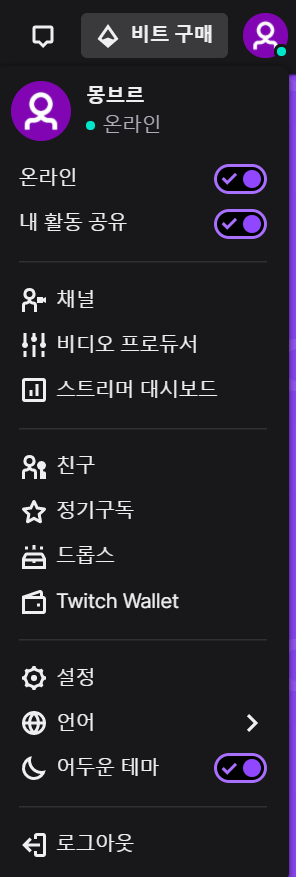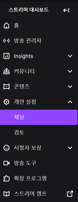 가장 기본적인 내용들은 스트리머 대시보드를 따라가는 것 만으로도 진행이 가능할 정도입니다. 트위치 로그인후 가장 우측 상단 프로필아이콘->스트리머대시보드로 이동해서 여러 정보를 확인해보세요.