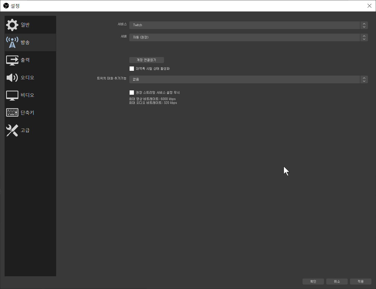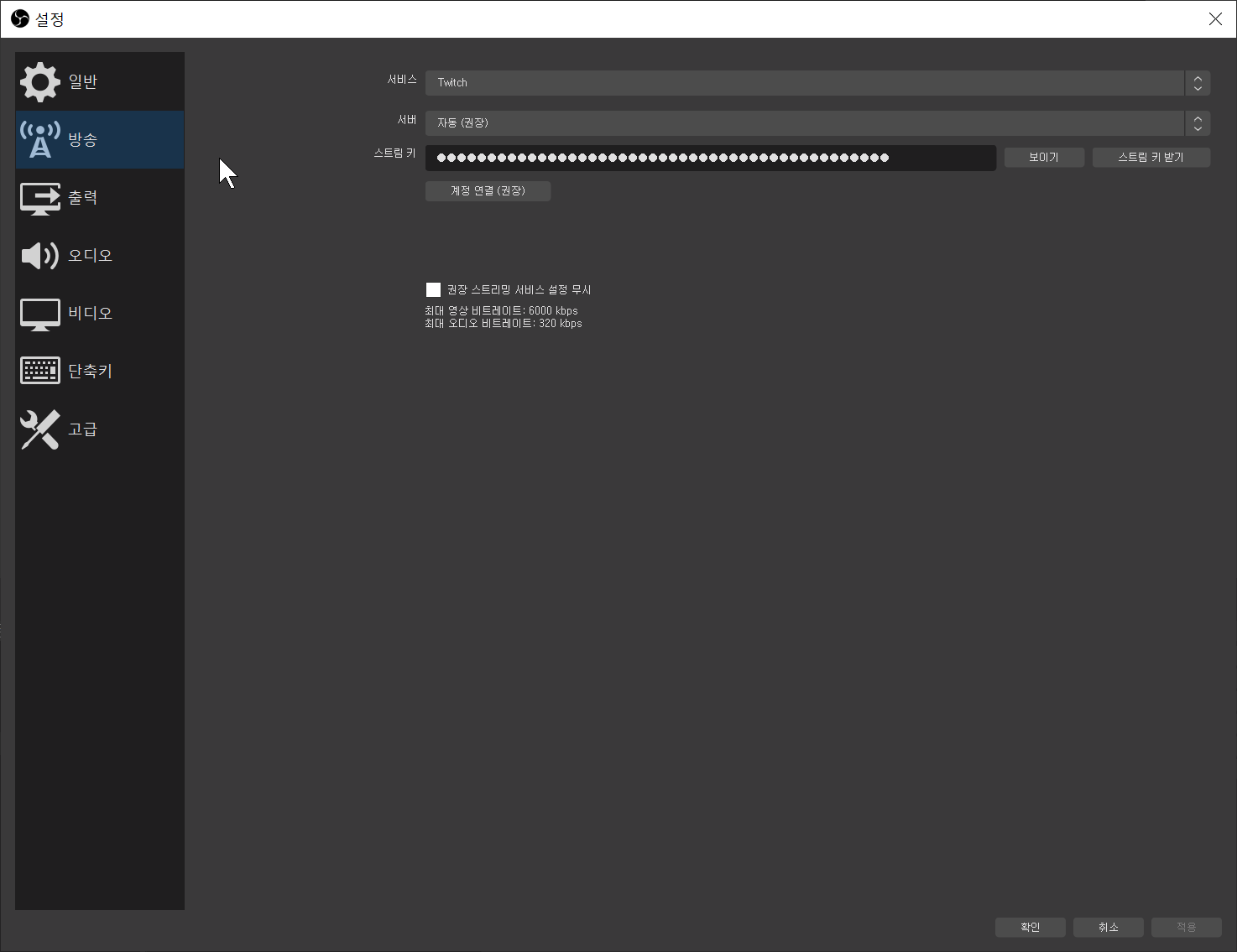 서비스 : Twitch / 서버 : 자동 / 스트림키 : 2번으로 올라가서 확인후 붙여넣기