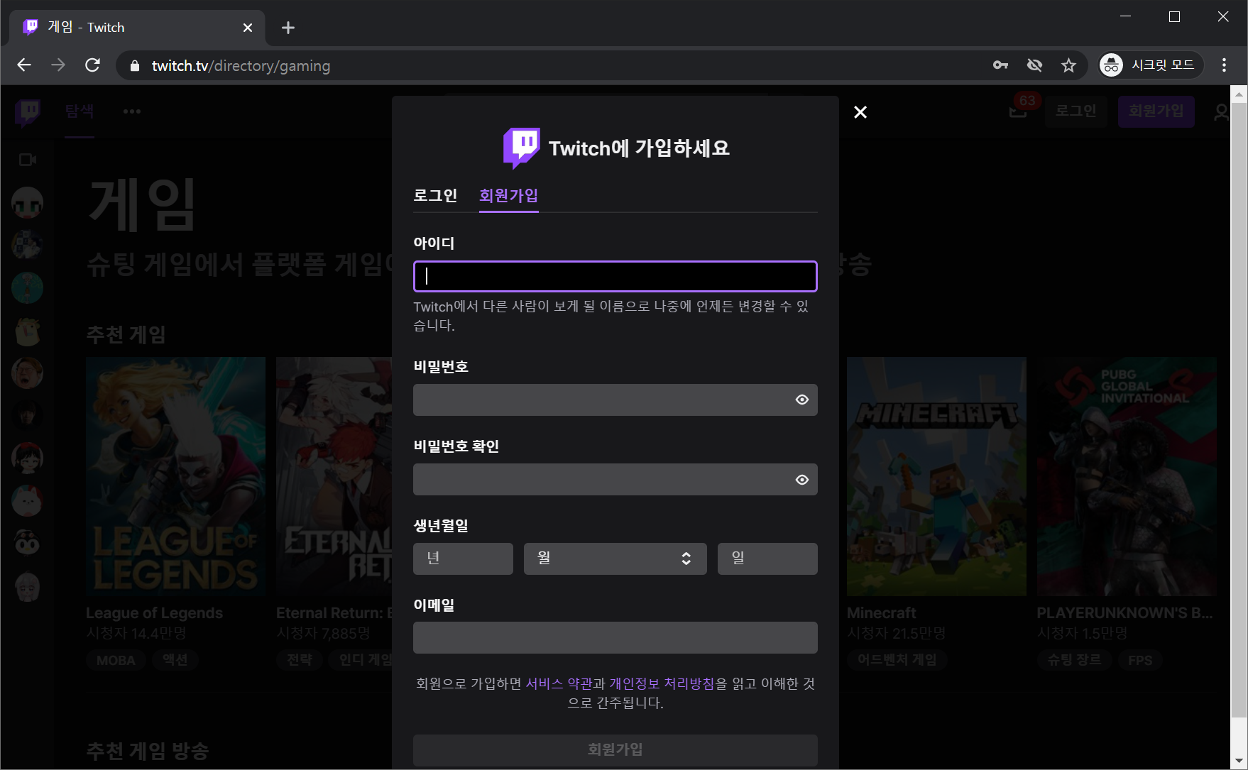 뭐 일단 트위치가서 가입을 하셔야 방송을 시작하든말든 뭘 하겠죠?? 간단한 정보 입력후에 가입을해줍니다.