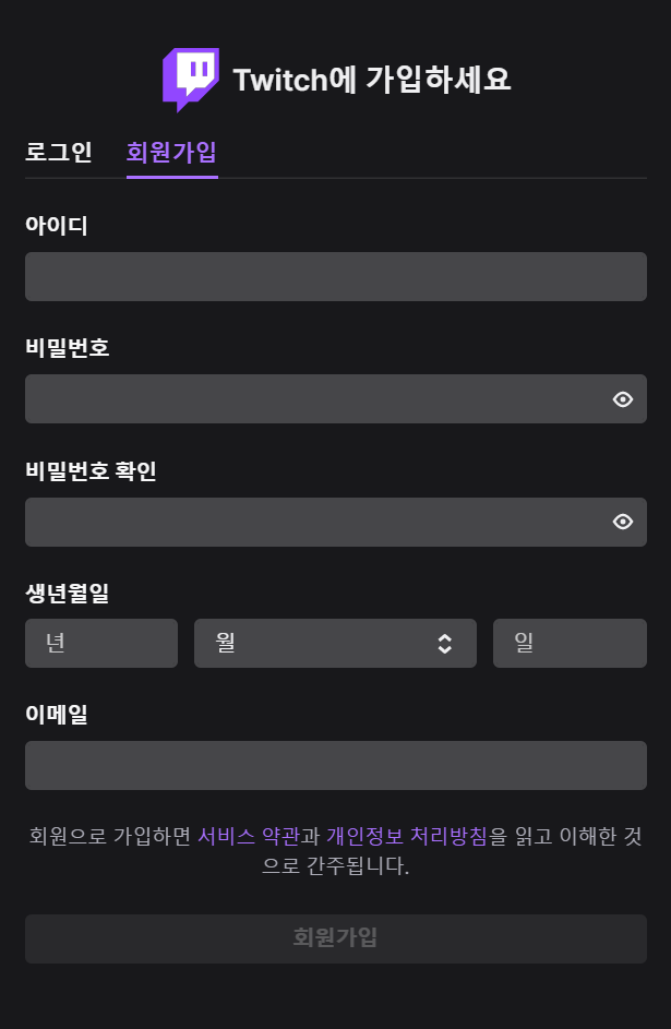 일단 트위치에 가입은 해야겠죠? 제일 우측 상단에 회원가입 버튼을 누르시고 순서대로 입력하고 회원가입을 해주세요. 여기서 아이디는 기본적으로 보여지긴 하지만 나중에 닉네임을 따로 설정 할 수 있습니다. 아이디 이외의 정보는 외부로 보여지지 않지만 그래도 일단 잘 적어서 가입해주세요. 이 아이디는 투네이션, 트윕, 스티키밤 각종 플러그인등 트위치 방송에 필요한 다양한 것들과 연결해야 하는 경우가 생기게 됩니다.