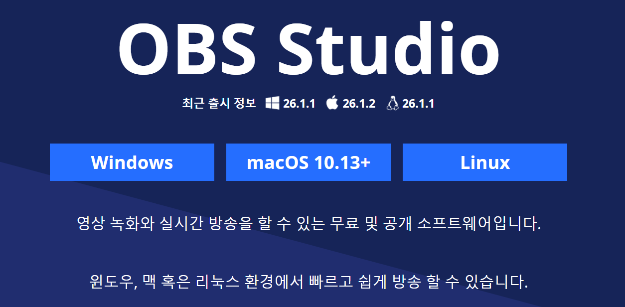 영상 녹화와 실시간 방송을 할 수 있는 무료 및 공개 소프트웨어입니다. 윈도우, 맥 혹은 리눅스 환경에서 빠르고 쉽게 방송 할 수 있습니다.