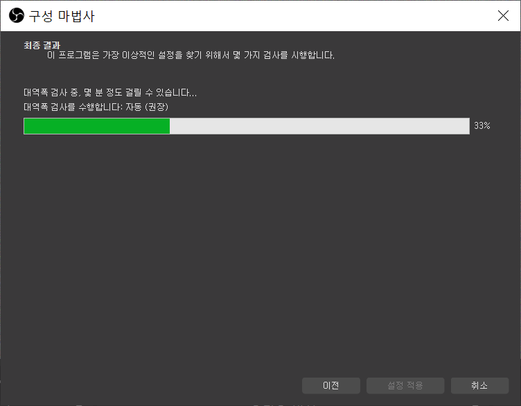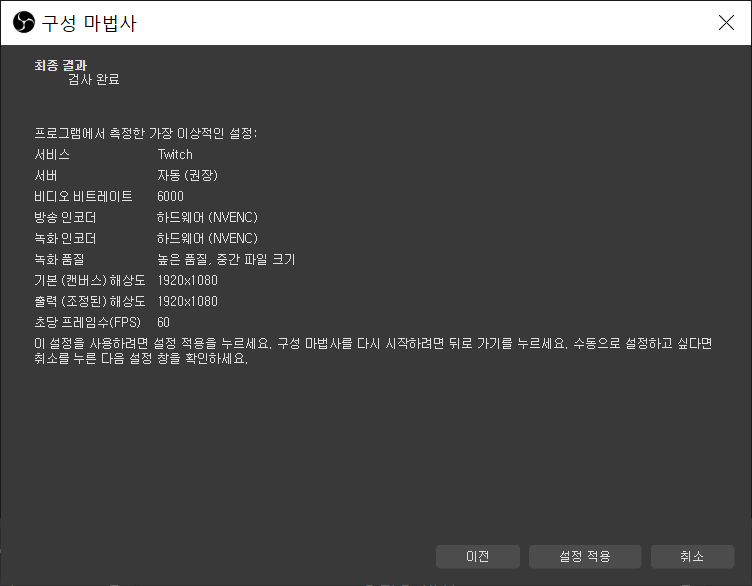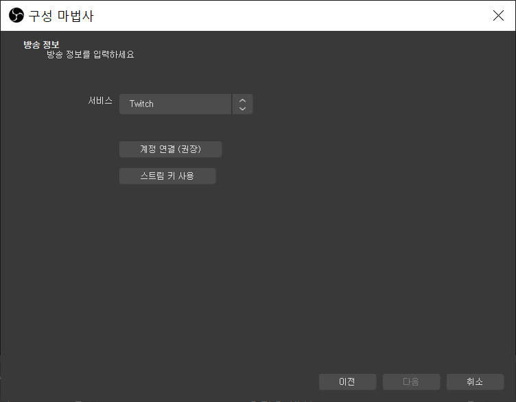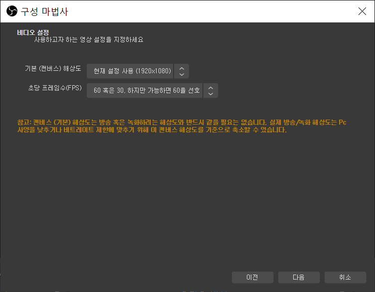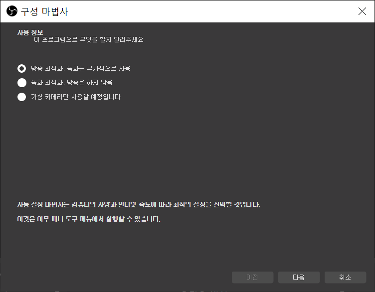 처음 실행하면 구성 마법사가 자동으로 실행되어 이거저거 물어보는 화면이 나오는데 기본 설정 자체도 방송하는데 꽤나 적합한 기본설정으로 나오고, 나중에 변경 가능하니 크게 신경 쓰실 필요는 없습니다. 이번 포스팅에서는 따로 변경하지 않고 기본 설정으로 진행 했습니다