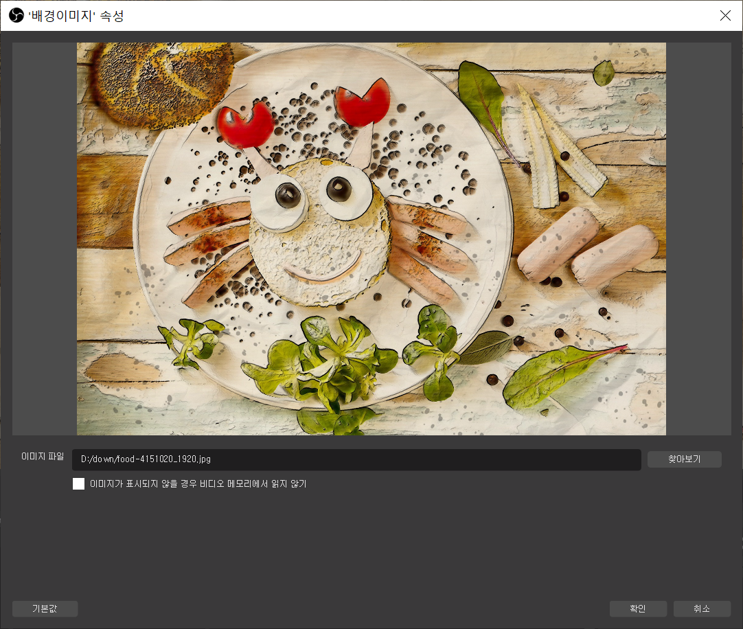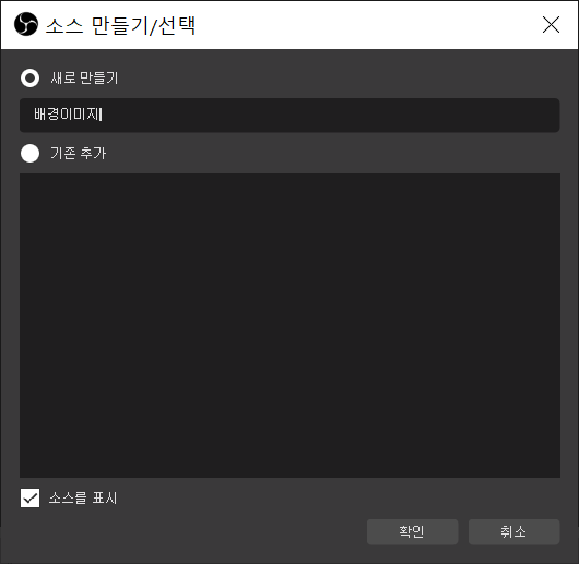 +버튼 -> 이미지 -> 소스제목입력 -> 이미지파일 불러오기 -> 확인의 순서로 이미지를 불러오면 OBS상에 이미지가 들어가는걸 볼 수 있습니다. 전 애초에 큰이미지를 불러와서 한번에 사이즈가 맞지만 안맞는다면 조절해줘야 합니다.