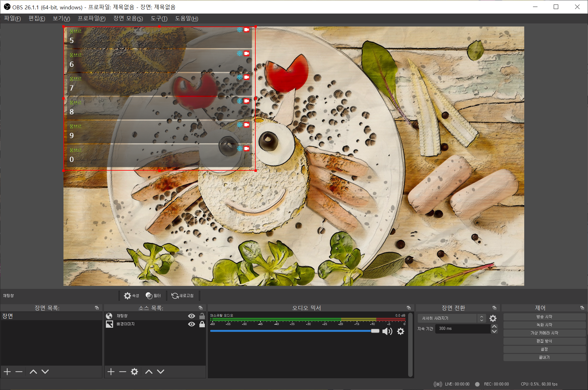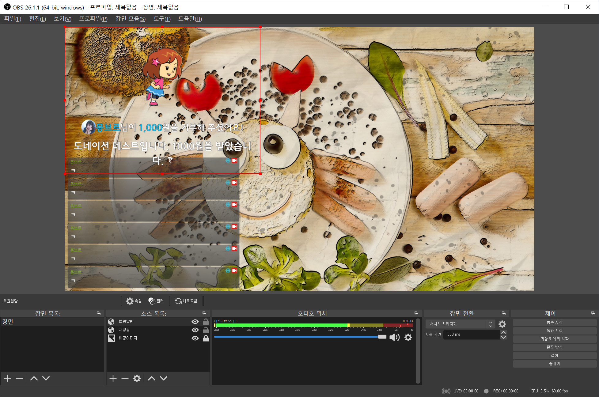 여기까지 오셨다면 이제 방송 화면상에 배경이미지/채팅창/후원알람까지 구성되셨을 겁니다. 정말 기초적인 부분을 마친 상태이지만 이상태에서 우측아래 방송시작 버튼을 누르셔도 정상송출에는 아마 지장이 없을 겁니다. 여기에서 부터 상황에 맞게 필요한 세팅을 바꾸고, 캡이나 기타 필요한 소스를 추가하고, 게임용 장면을 추가해가면서 진행하시면 되겠습니다.