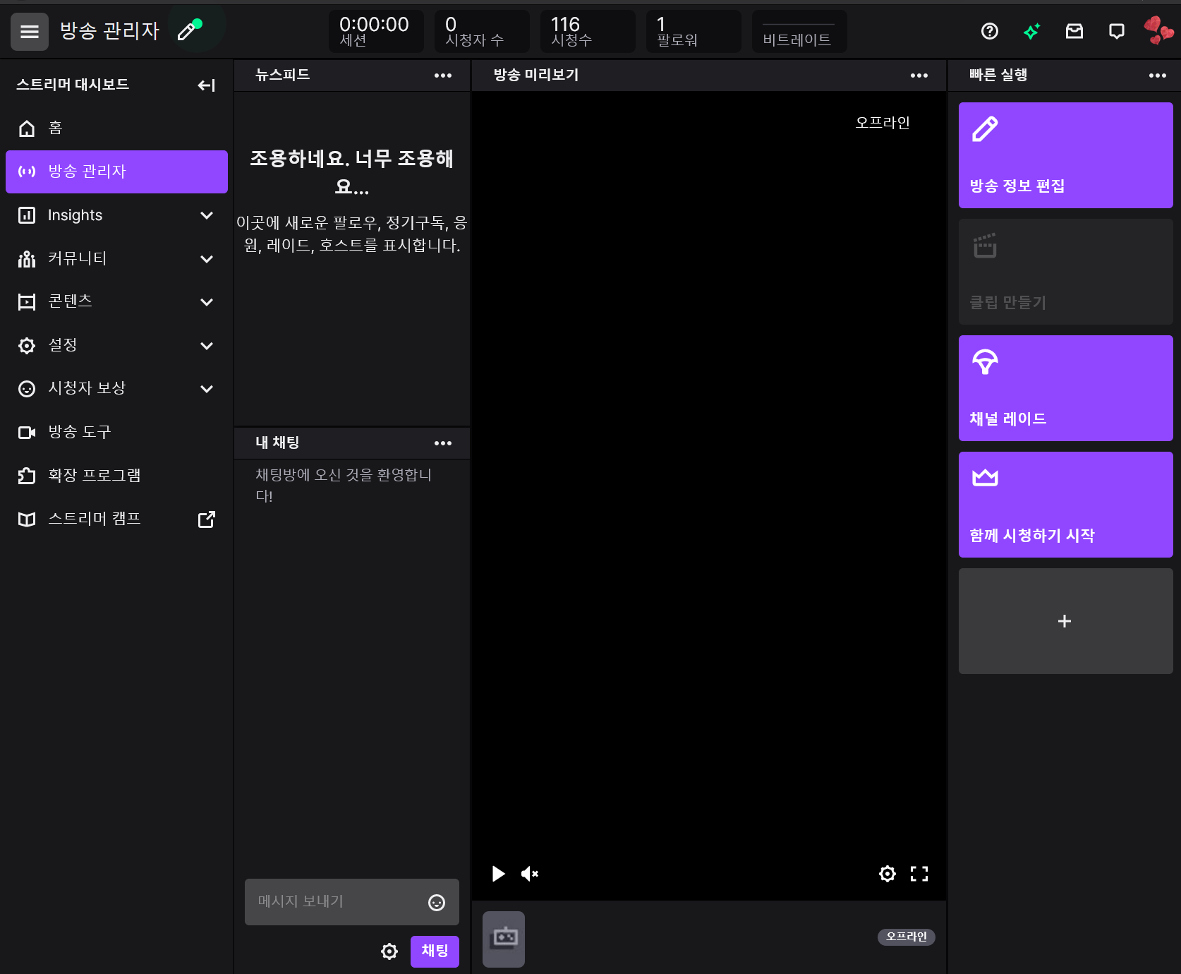 일부러 방송을 한번도 킨적 없는 계정으로 대시보드를 들어갔는데 왜 시청수가 찍혀있나 모르겠네요;; 아무튼 뭐 다양한 정보를 확인하고 방송을 관리할수 있는 영역입니다.