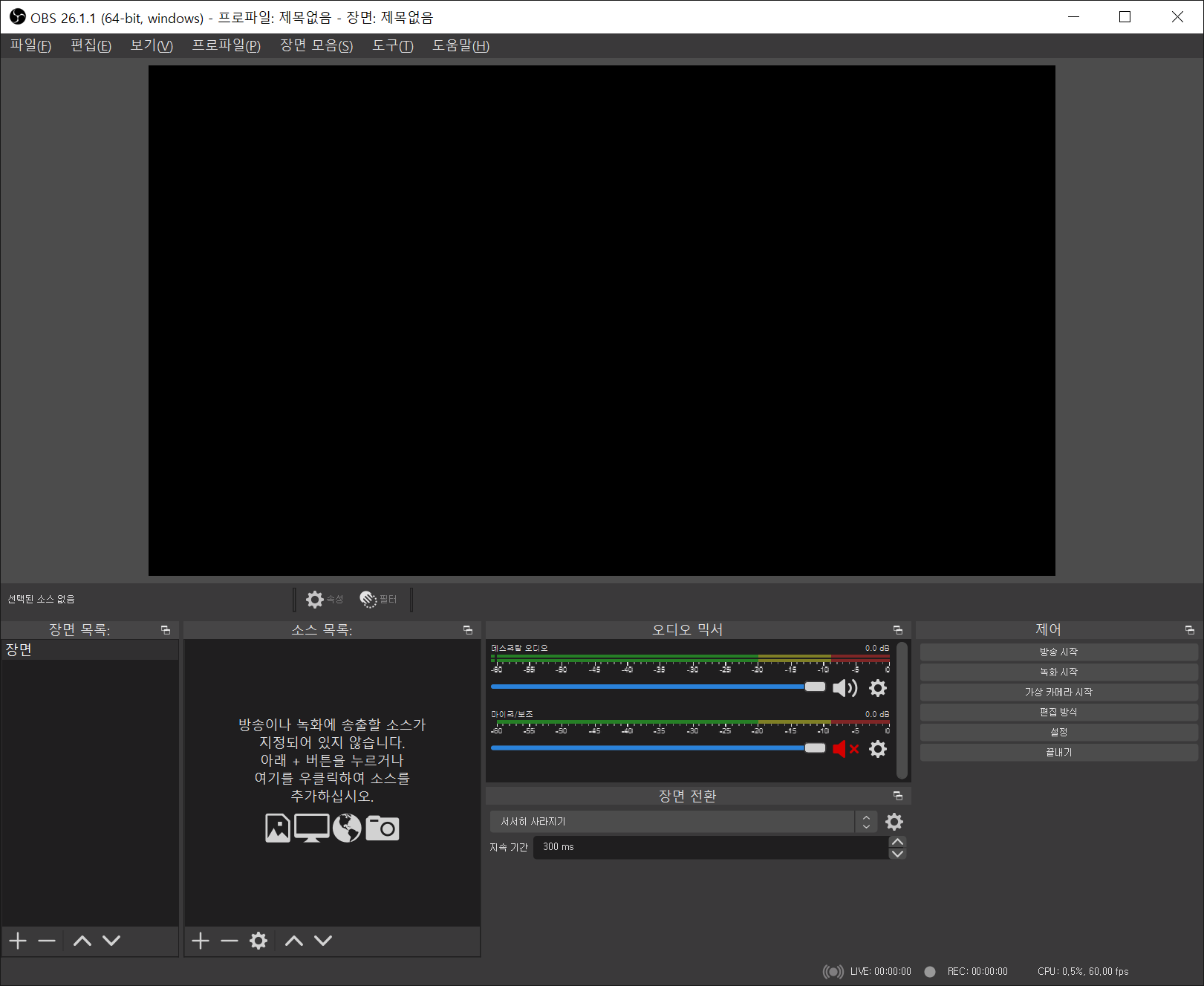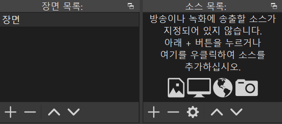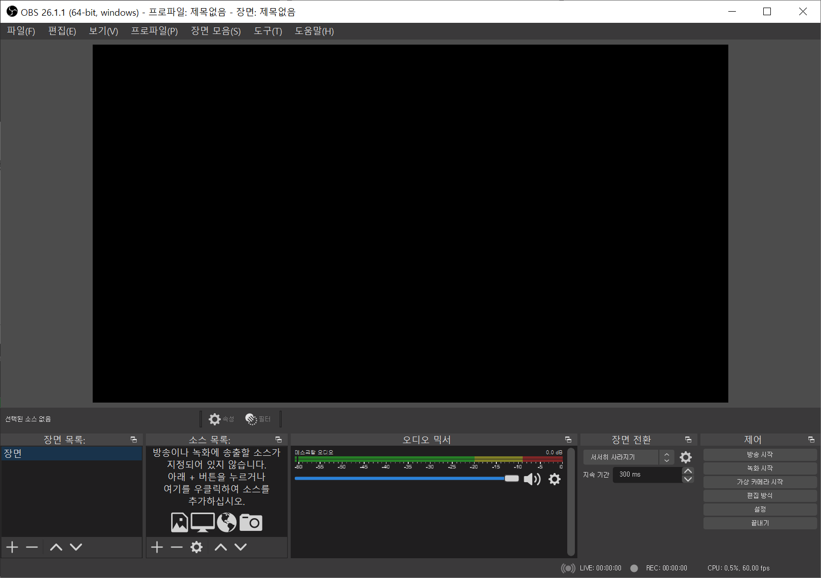 OBS가 실행되었으나... 아무것도 없고 까만 화면만 보이게 됩니다. 이제 몇가지 소스를 올려서 기본적인 방송 화면 구성을 해보겠습니다.