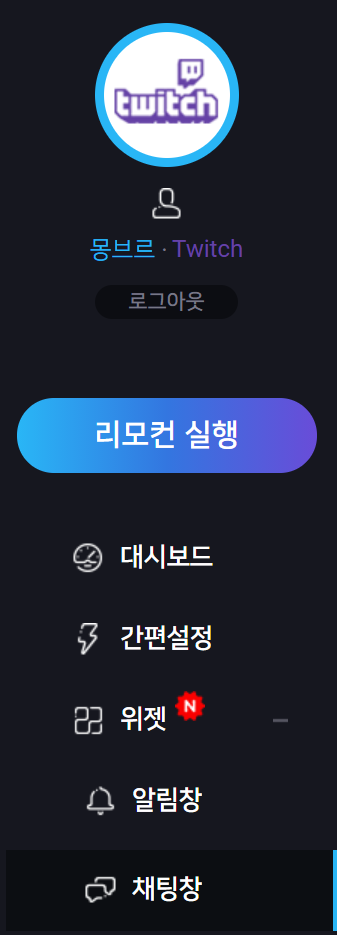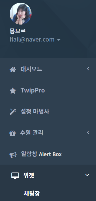 투네이션(https://toon.at), 트윕(https://twip.kr) 등의 사이트에 들어가면 대시보드->위젯->채팅창 에서 채팅창 위젯 URL을 얻을 수 있습니다.