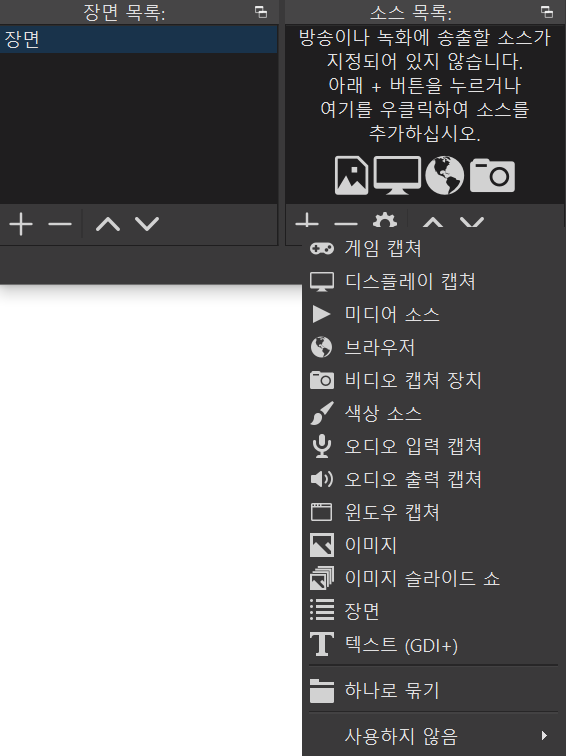 왼쪽 하단에 보면 소스목록이라는 부분이 있습니다. +버튼을 눌러서 확장되는 곳에보면 여러가지가 나오게되죠? 여기서 배경이미지, 배경음악, 채팅, 후원알람등 화면에 출력되는 소스를 추가 할 수 있습니다.