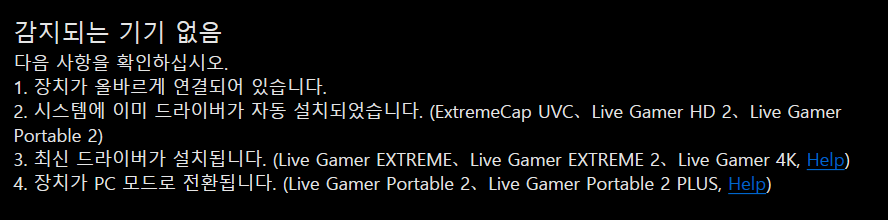그 다음으로 정상적으로 라인을 다 꼽고 설정했음에도 프로그램에서 캡쳐보드를 인식하지 못하는 경우가 있을 수 있습니다. 이런경우 캡쳐보드 전원을 껏다 켜면 인식되는 경우가 많습니다.