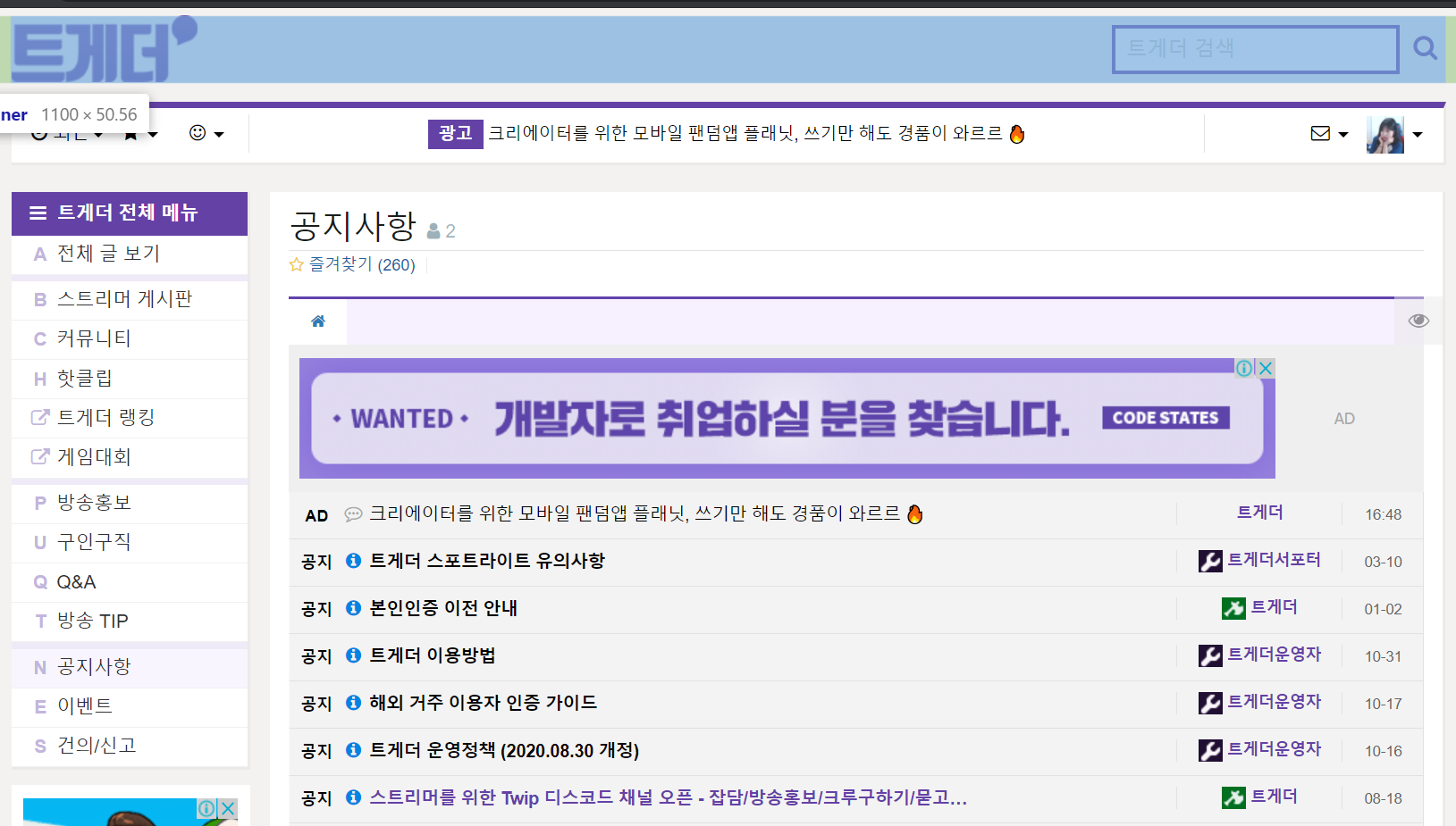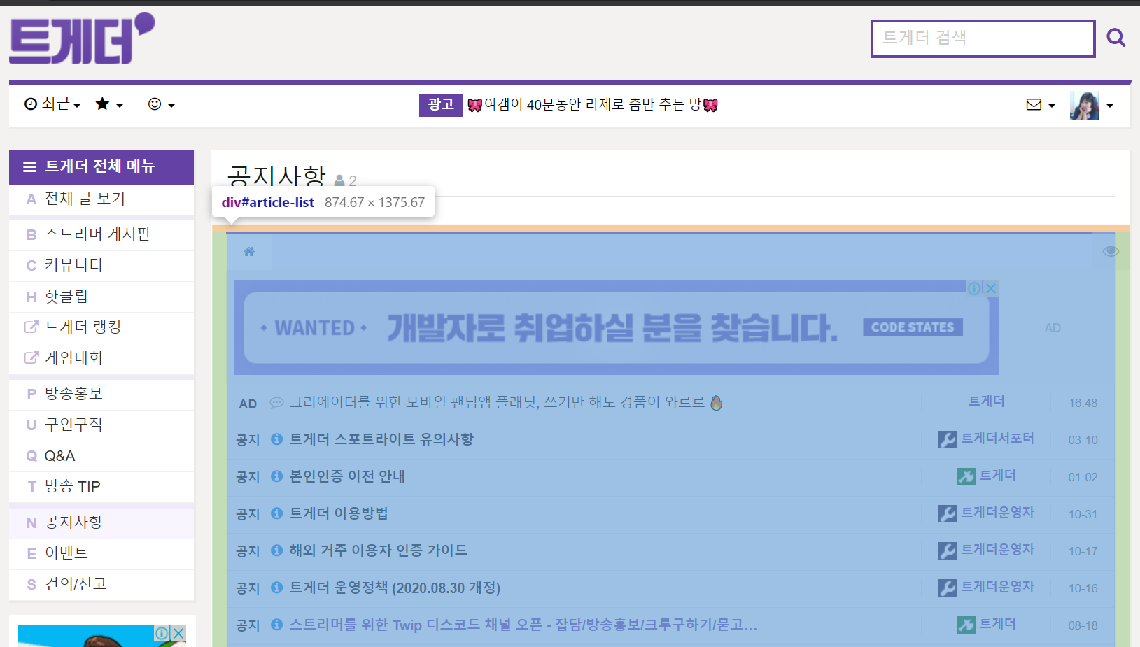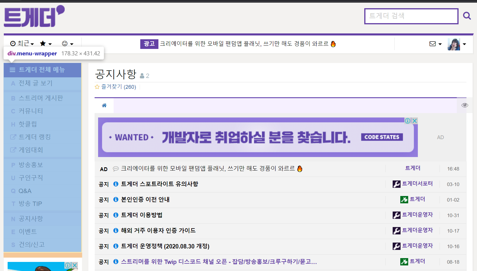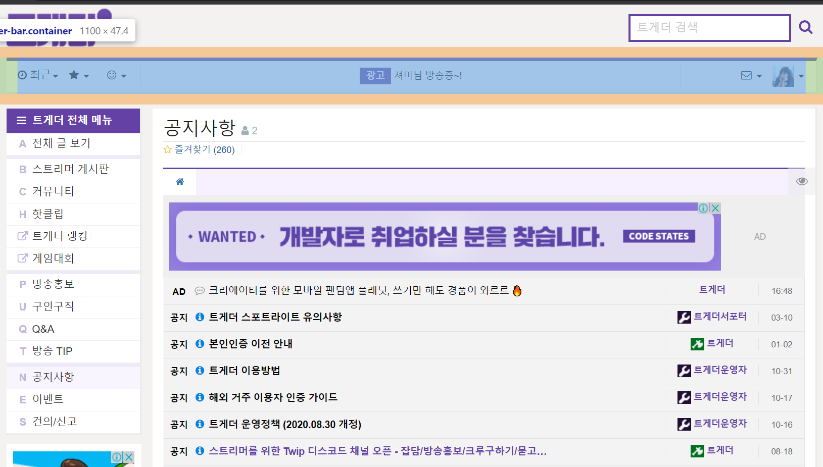 트게더는 트윕에서 운영중인 스트리머와 시청자의 소통공간입니다. 스트리머게시판 생성시 제공해주는 기본양식 이외에도 CSS를 수정해서 원하는 배너나 색상등을 사용 할 수 있습니다. CSS수정 관련해서 기초적인 부분을 좀 알아볼까 합니다.