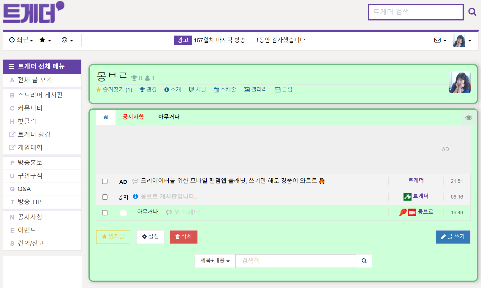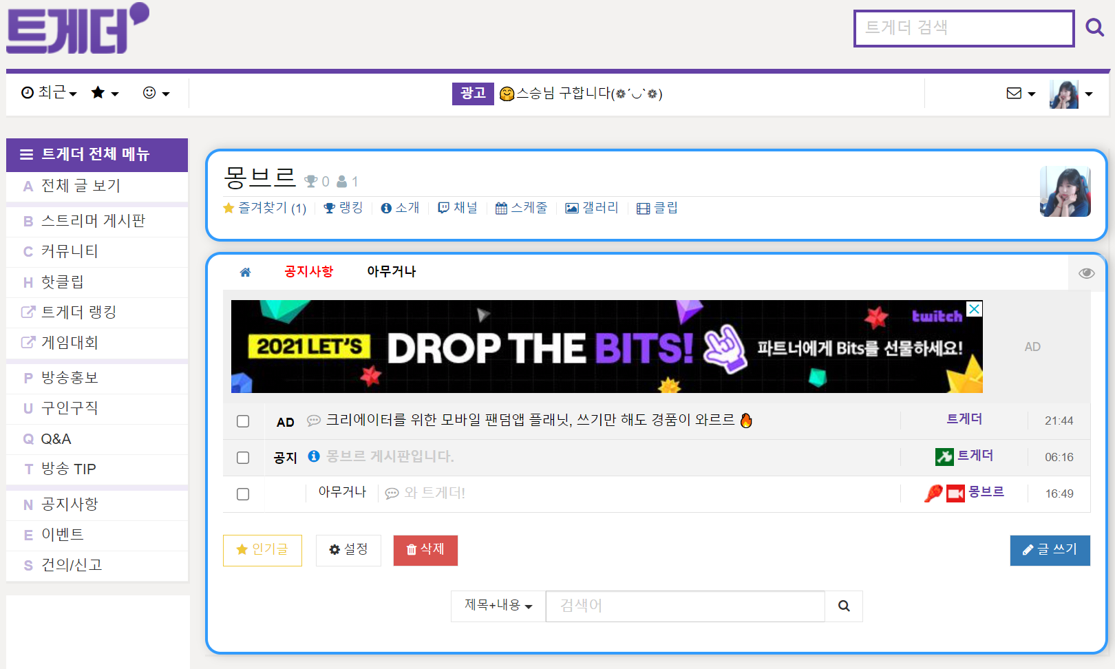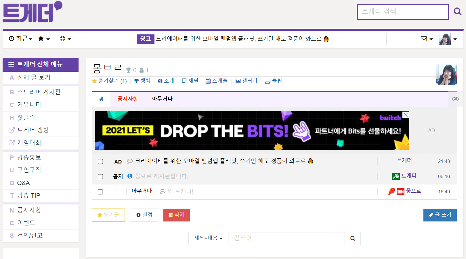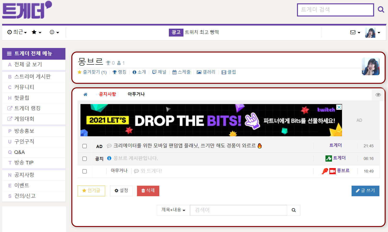 트게더는 트윕에서 운영중인 스트리머와 시청자의 소통공간입니다. 스트리머게시판 생성시 제공해주는 기본양식 이외에도 CSS를 수정해서 원하는 배너나 색상등을 사용 할 수 있습니다. CSS수정