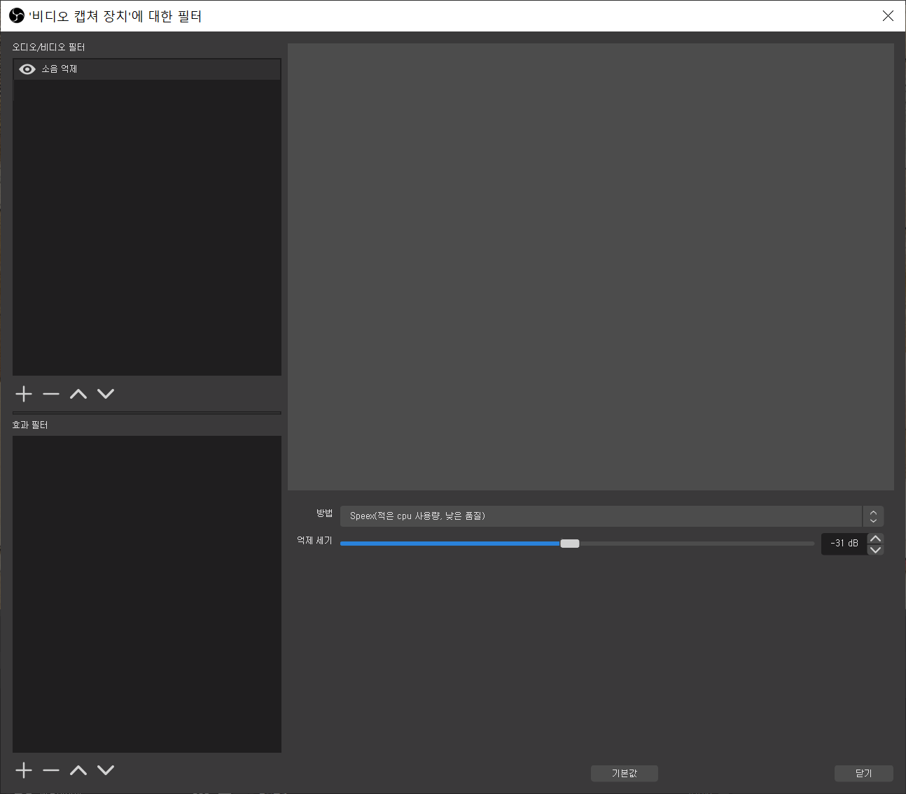 왼쪽처럼 그냥 RNNoise로 놓고 문제가 해결된다면 가장 굳 케이스겠지만. 잡음은 제거되었으나 마이크가 물먹은 것처럼 먹먹해진다거나, 여전히 잡음이 들리는 경우엔 방법에서 Speex로 변경해주시고 억제 세기를 조절해가면서 소리를 들어보시는 것이 좋습니다.