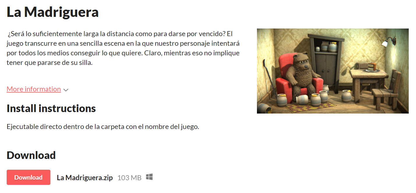 사이트에 들어가셔서 다운로드 버튼을 눌러주시면 압축파일로 다운로드 됩니다. 압축 풀어주시면 파일이 몇개 있는데 그중에서 [La Madriguera.exe]를 실행해주시면 됩니다.