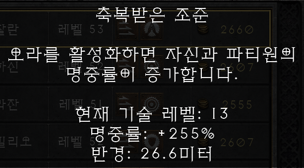 | 일반 / 지옥 | 축복받은 조준(블레시드 에임) | 명중률 상승 |