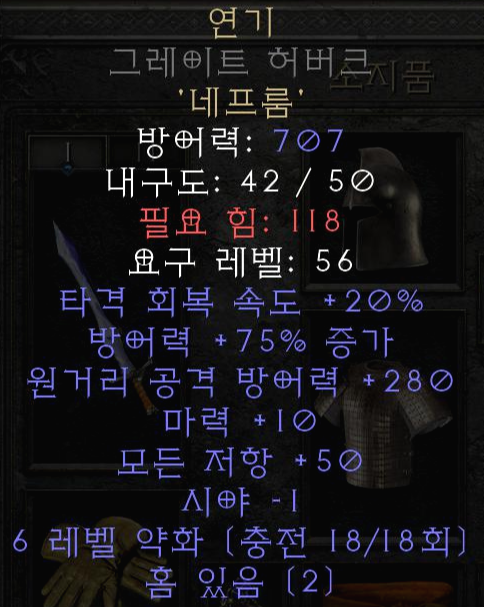 연기 룬워드는 이제 막 악몽(나이트메어)난이도를 졸업하고 지옥(헬)난이도에 진입하는 맨땅 유저들의 모자란 저항을 메꿔주는 갑옷 룬워드입니다. 맨땅에 헤딩하시는 분들은 룸룬이 잘 안나와서 재료템으로 고민하실텐데 적당히 만드셔도 괜찮다고 생각합니다. 방어력도 물론 중요하지만 저항이 우선이죠 ㅠㅠ