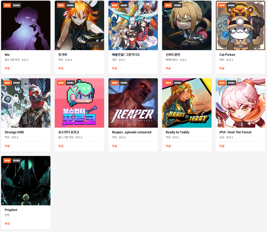 이번에 올라온건 총 11개 작품입니다. 스컬이 생각나는 횡스크롤 액션에 커맨드를 더한 NIX, 동양풍 판타지액션이 마치 K다크소울(?) 같은 돗가비, 멀티지원에 더빙까지해서 높은 완성도를 보여주는 배틀전설! 그랑가디오, 전우치의 시원시원한 핵엔슬래시 신비도원전, 귀염 뽀짝한 고양이가 곡괭이를 던지는 액션 Cat Pickax, 액션에 퍼즐요소를 가미한 Strange ONE, 보스만팬다!!! 귀염뽀짝 해결사 보스헌터 포르코 등등 총 11개 작품이 스토브에서 무료로 플레이 가능하니 입맛대로 골라서 플레이 해보시면 될 것 같습니다!