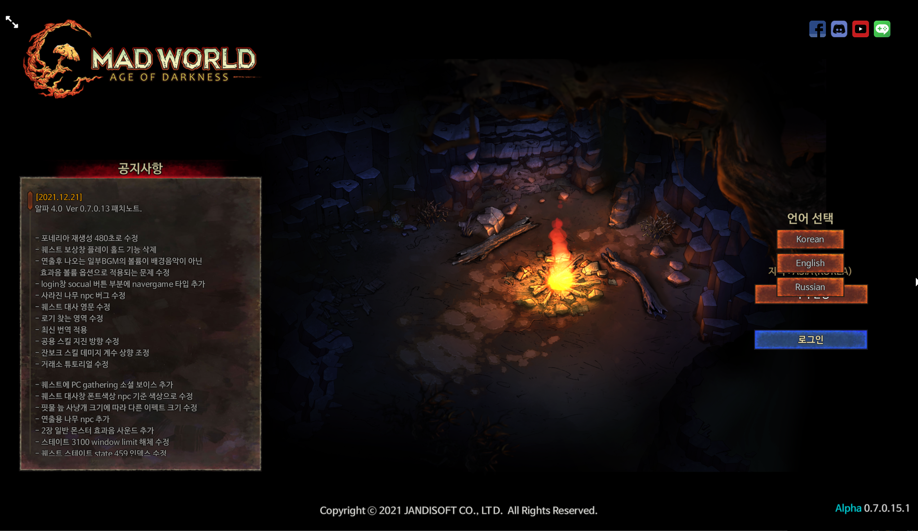 다양한 로그인 방법과 3가지 언어를 지원하고 있습니다. 디폴트값이 영어로 되어있으니 한국어를 선택하고 게임을 한번 재시작 해주셔야 한글이 보여지게 됩니다.