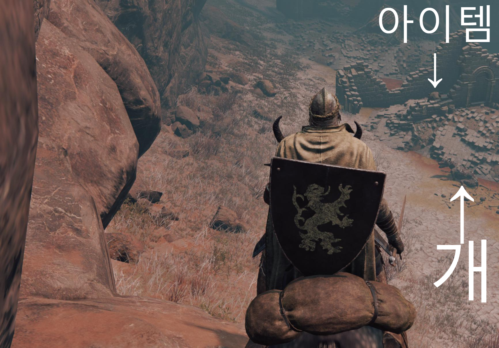 저는 이미 먹어서 표시가 안되는데 언덕 끝에 오면 우측에 무너져 내린 작은 건물이 보이고 안에 아이템이 하나 있습니다. 그 앞에 개가 한 마리 있는데.. 저 개가 상당히 거슬립니다 ㄱ-