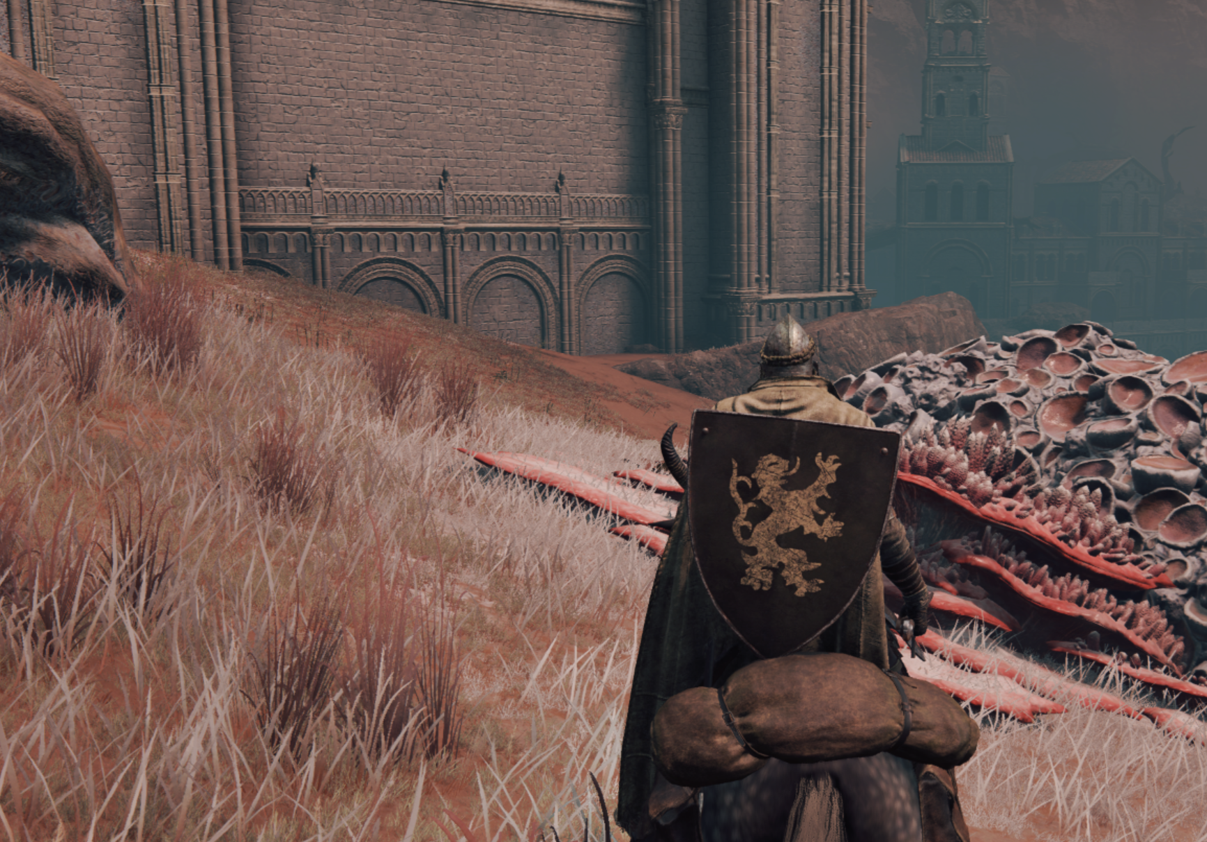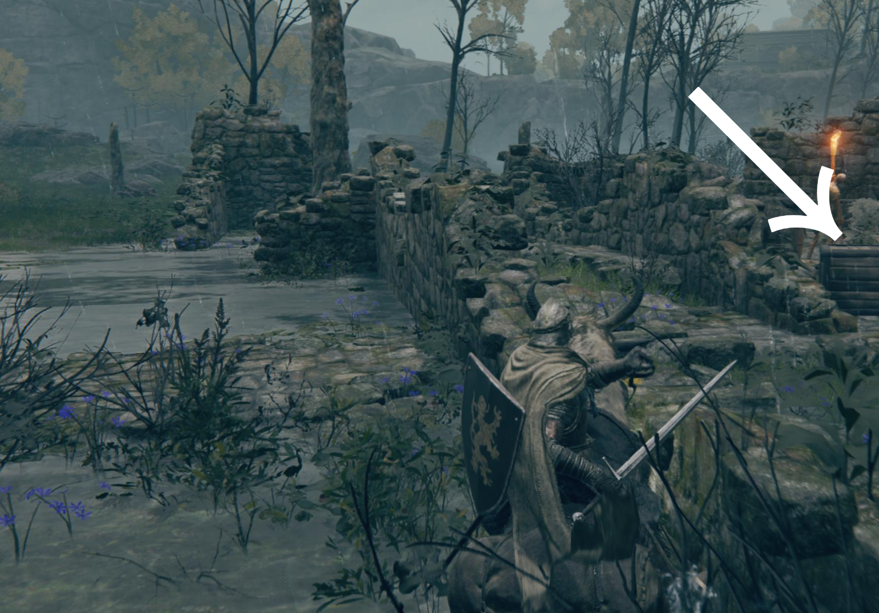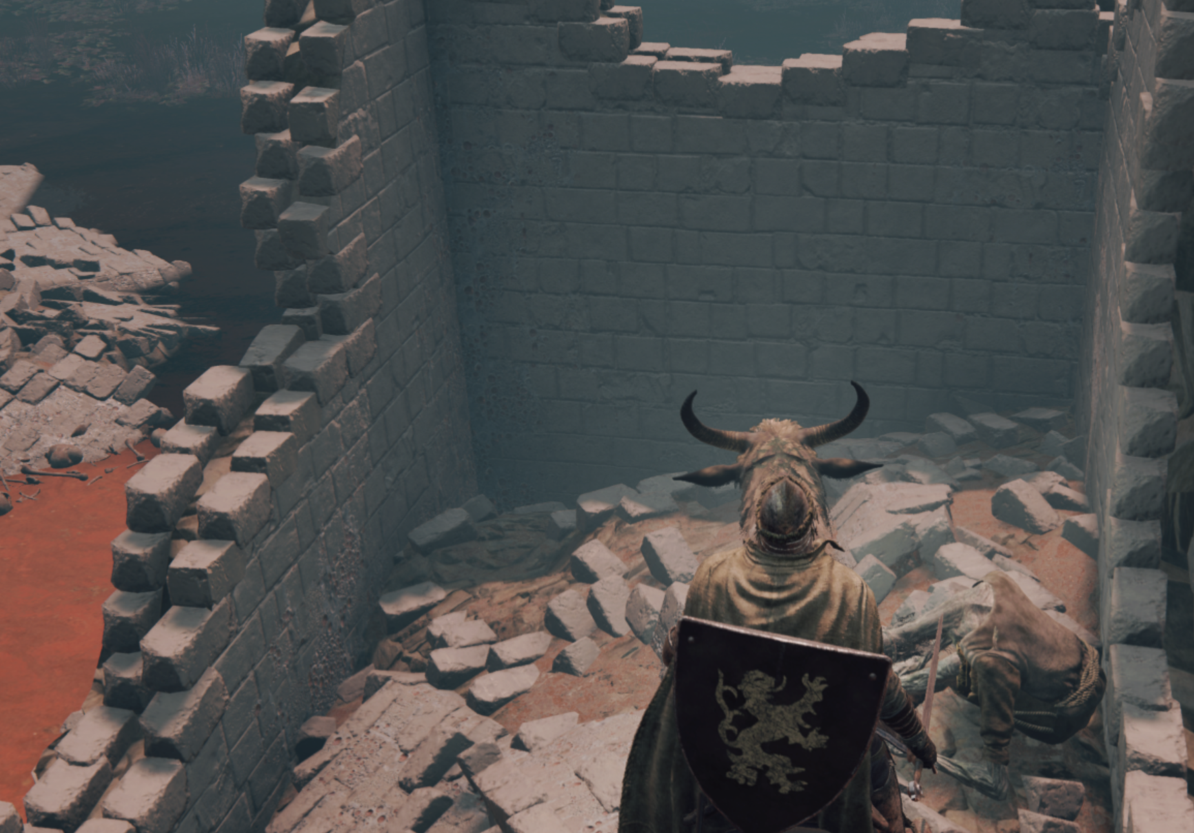 직진해서 개를 피하는 공략도 있던데 저는 그냥 얼른 먹고 도망가는 방법을 선택했습니다. 입구에서 바로 왼쪽을 보시면 성벽이 보입니다.