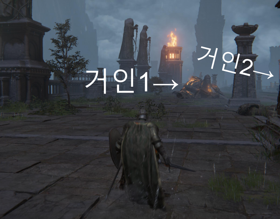 계단을 쭉올라가서 진입하시면 거인이 총 3마리 등장합니다. 잡고 가셔도 되지만 귀찮으니 한쪽 벽으로 붙어서 최대한 피해가겠습니다. 저는 좌측으로 피해갔습니다.