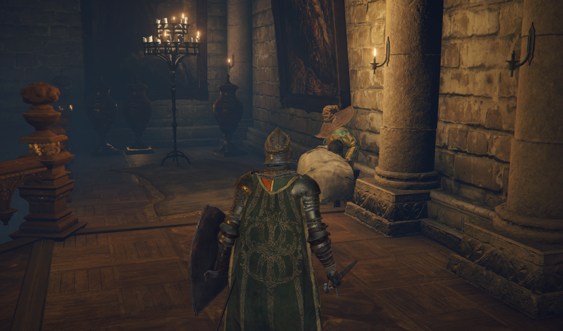 원탁에서 캐릭터 우측에 벽난로를 두고 앞을 보면 샹들리에가 보입니다. 저문으로 나가주세요.